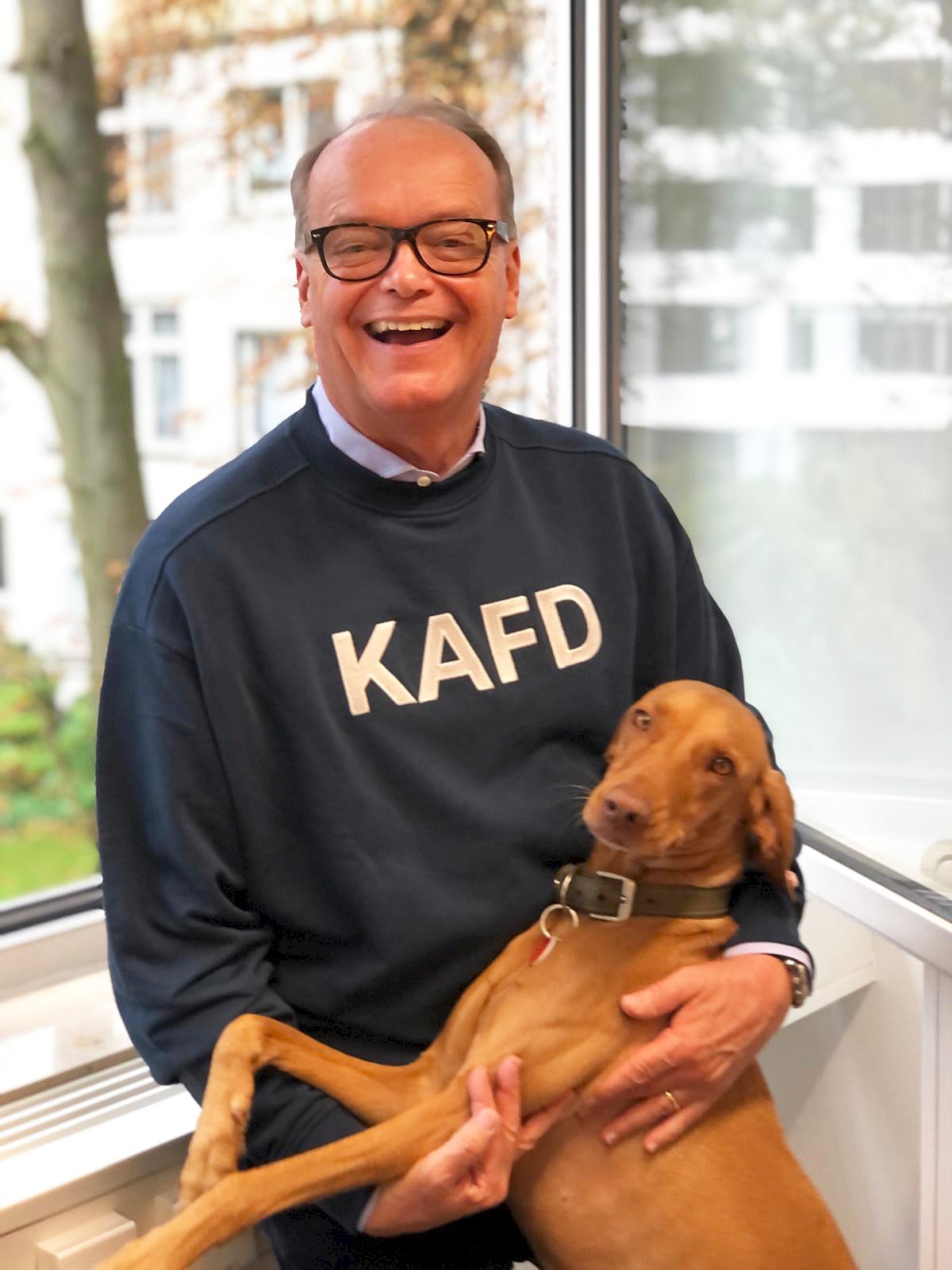 BURCKHARD PLESSER, 64, Unternehmer, mit MAP-Bürohund SISSI, 3, beide Frankfurt am Main (Germany)