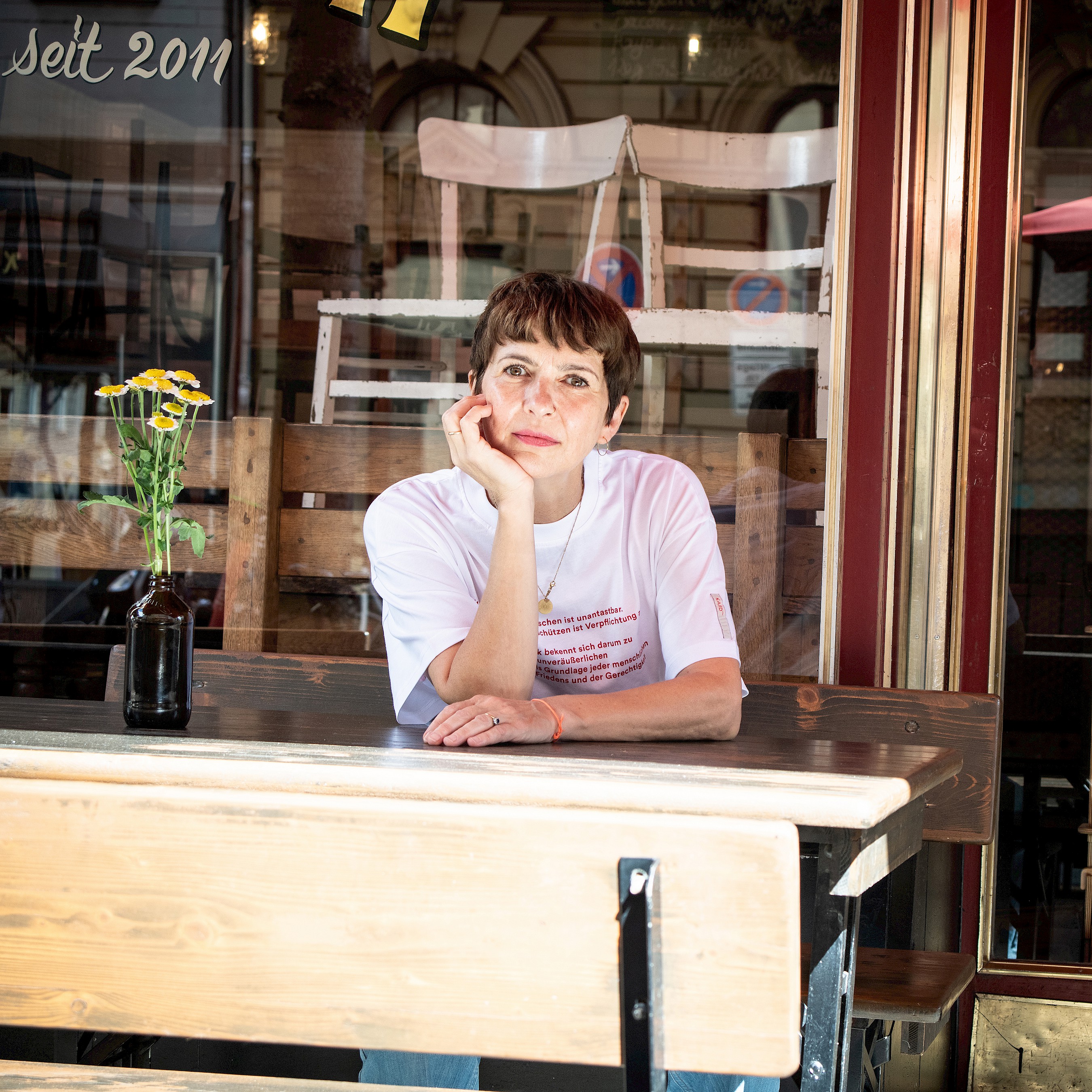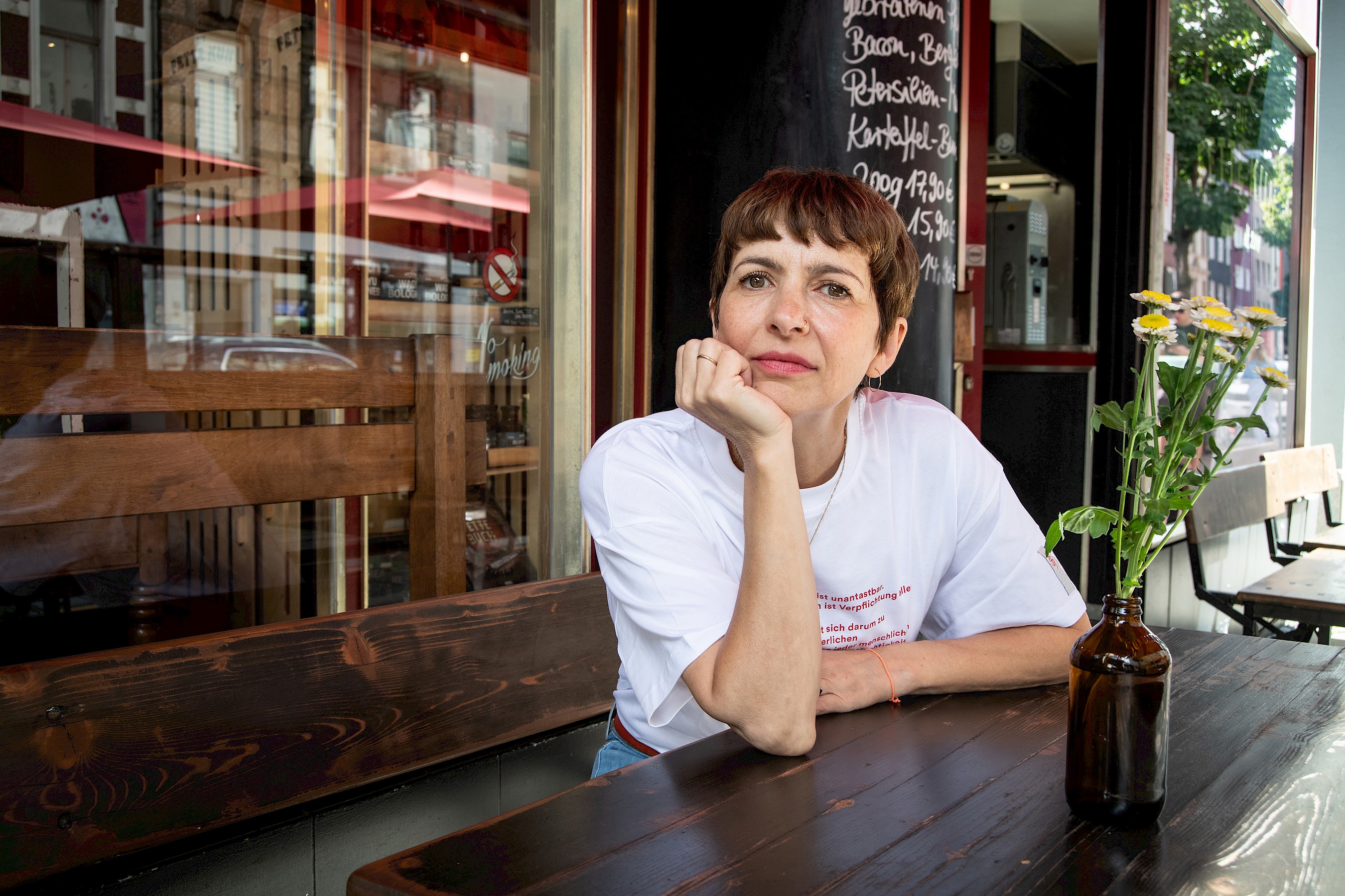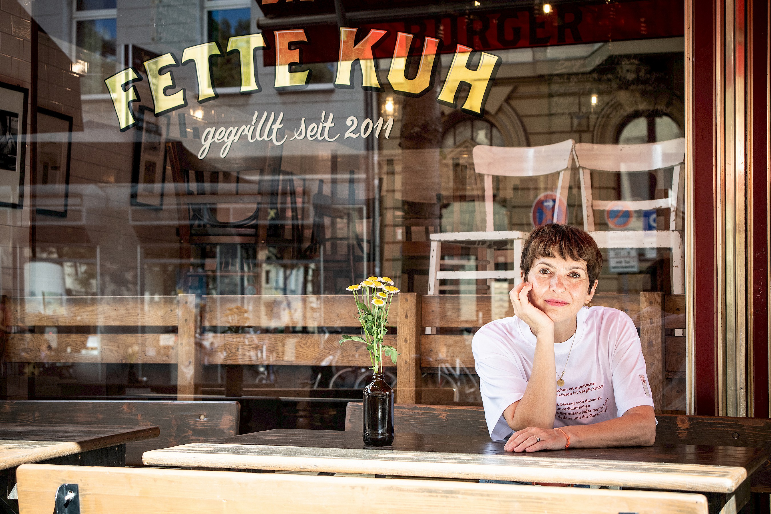 Entrepreneur and boss of Die Fette Kuh. Born in Bucharest, came to Germany as an asylum seeker at the age of 3 and landed here well. In her first life, an actress, and then 14 years ago opened Die Fette Kuh with Walter. Vegetarian for 30 years. No comment.