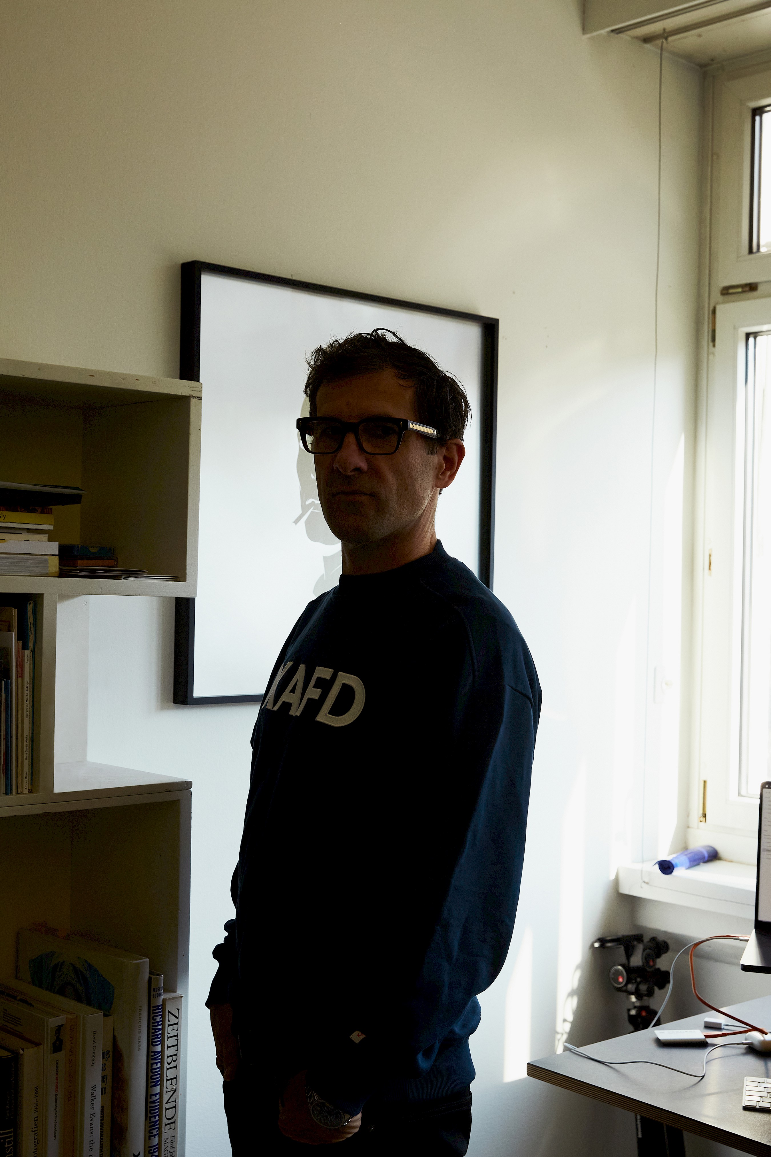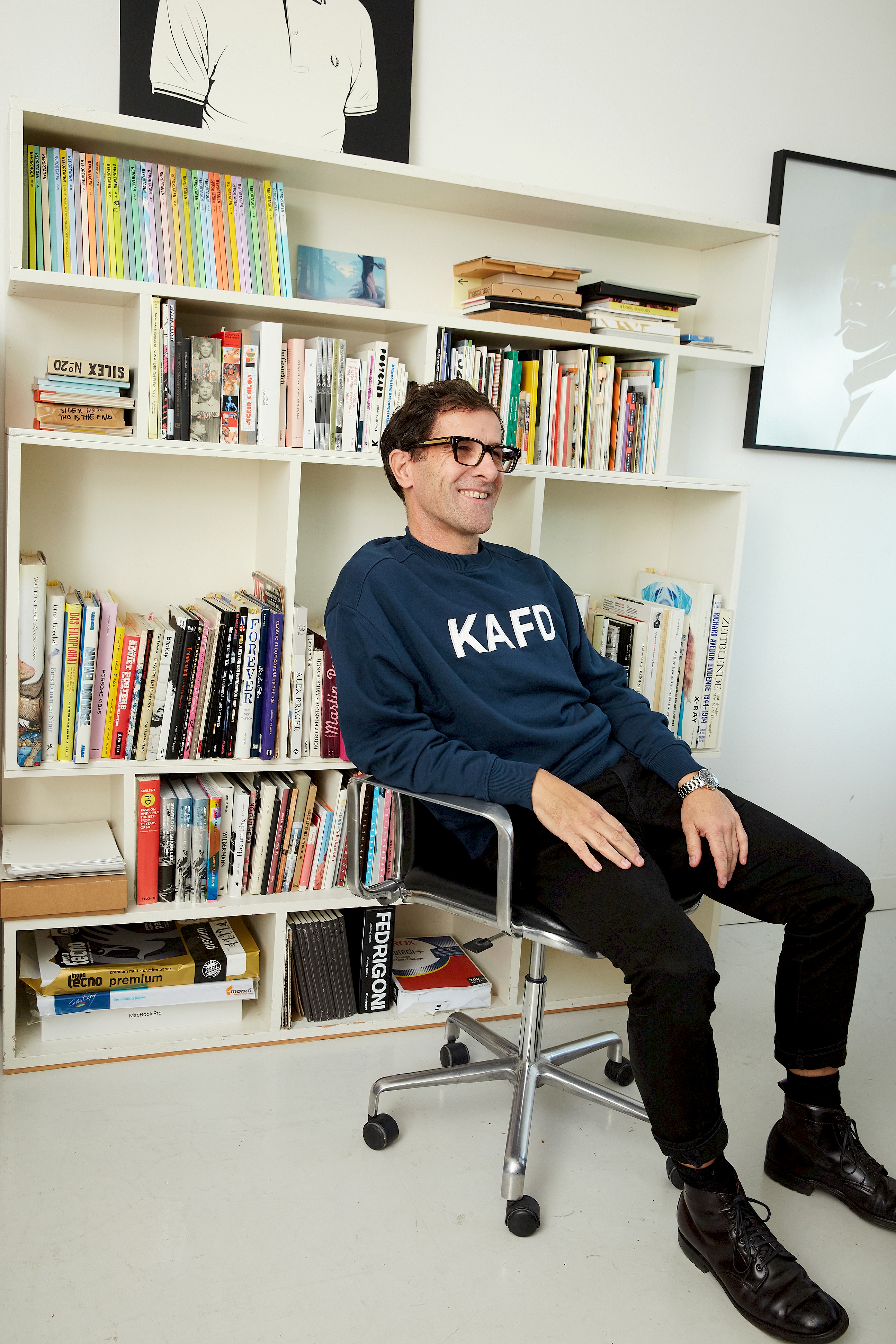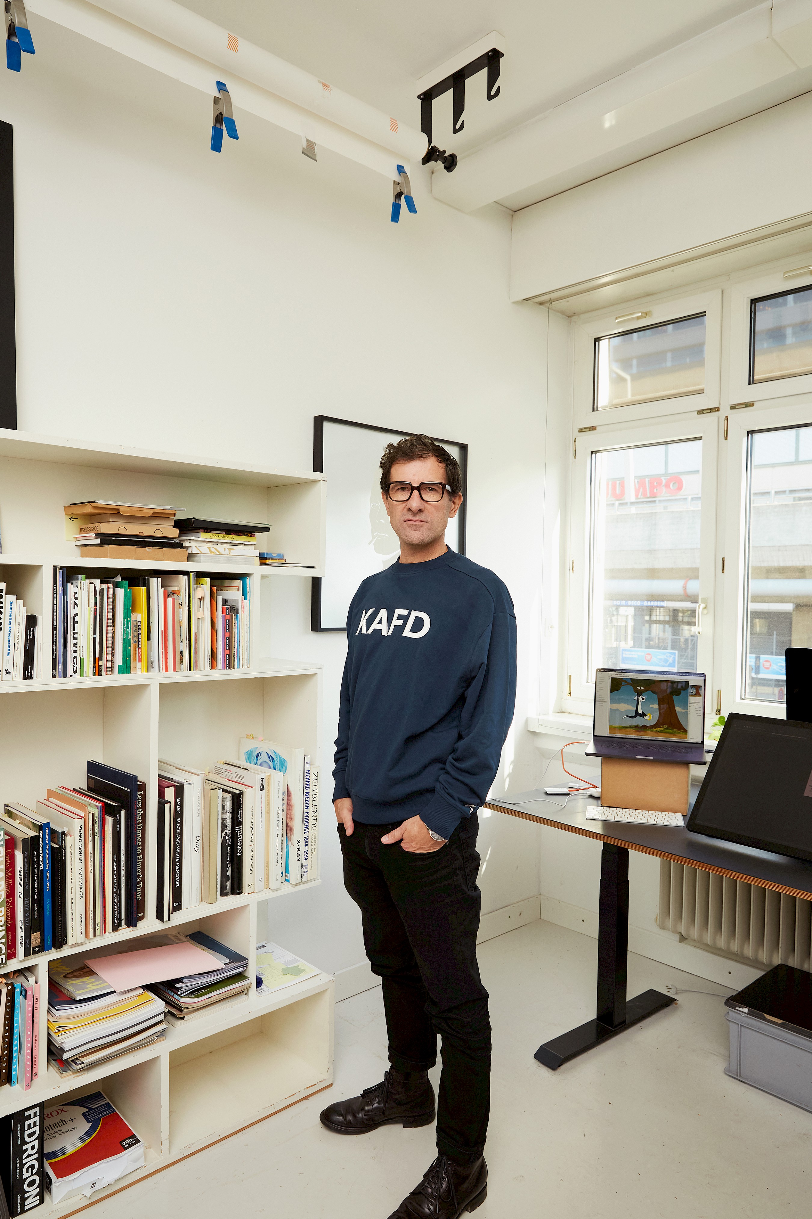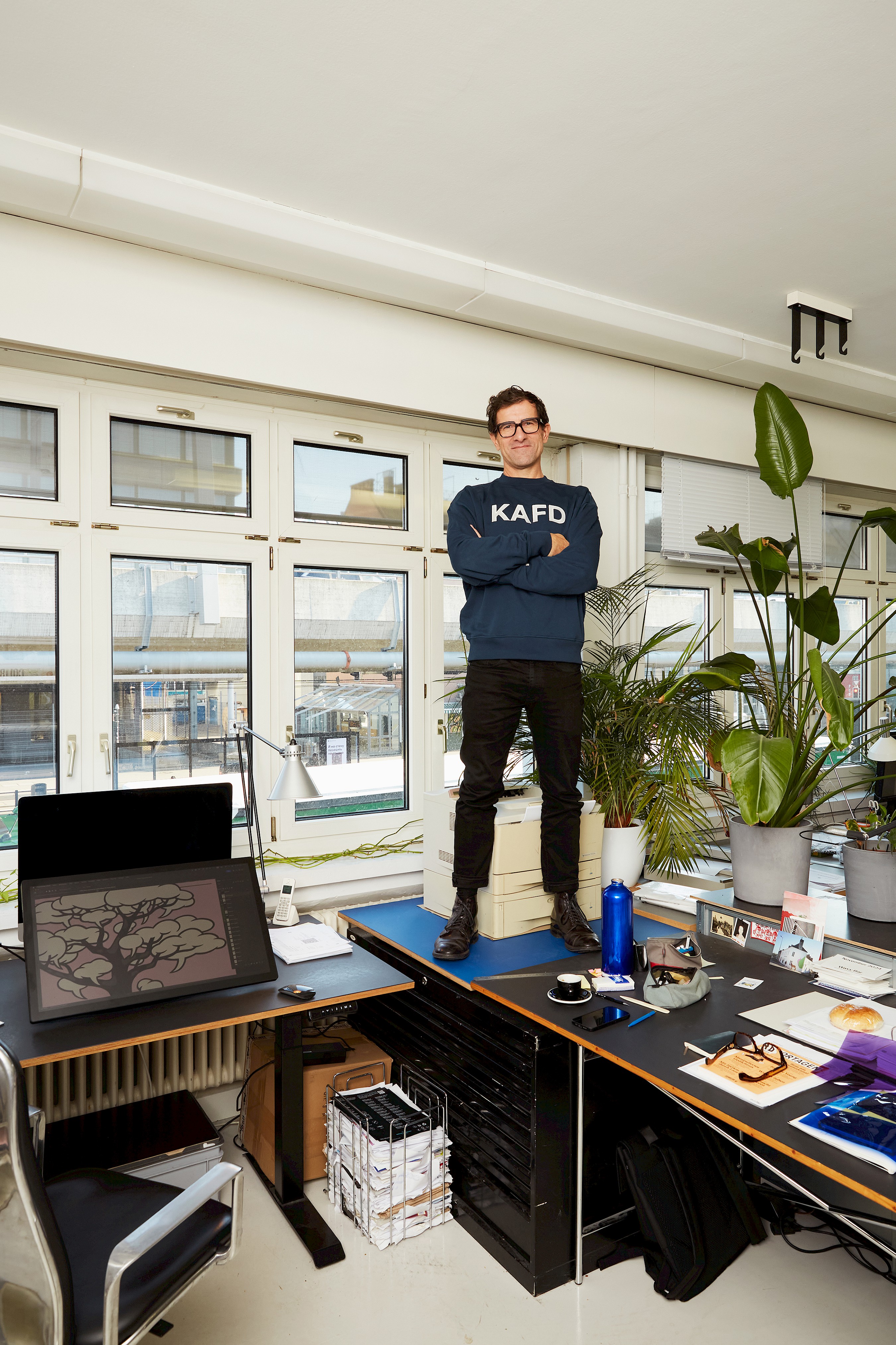 In his workspace, he has many books and magazines close at hand, which he still often uses for research and inspiration. His main tool is a computer with a large digital drawing pad. Most of the drawings are created on the computer, it allows sampling and enables ideal contouring.