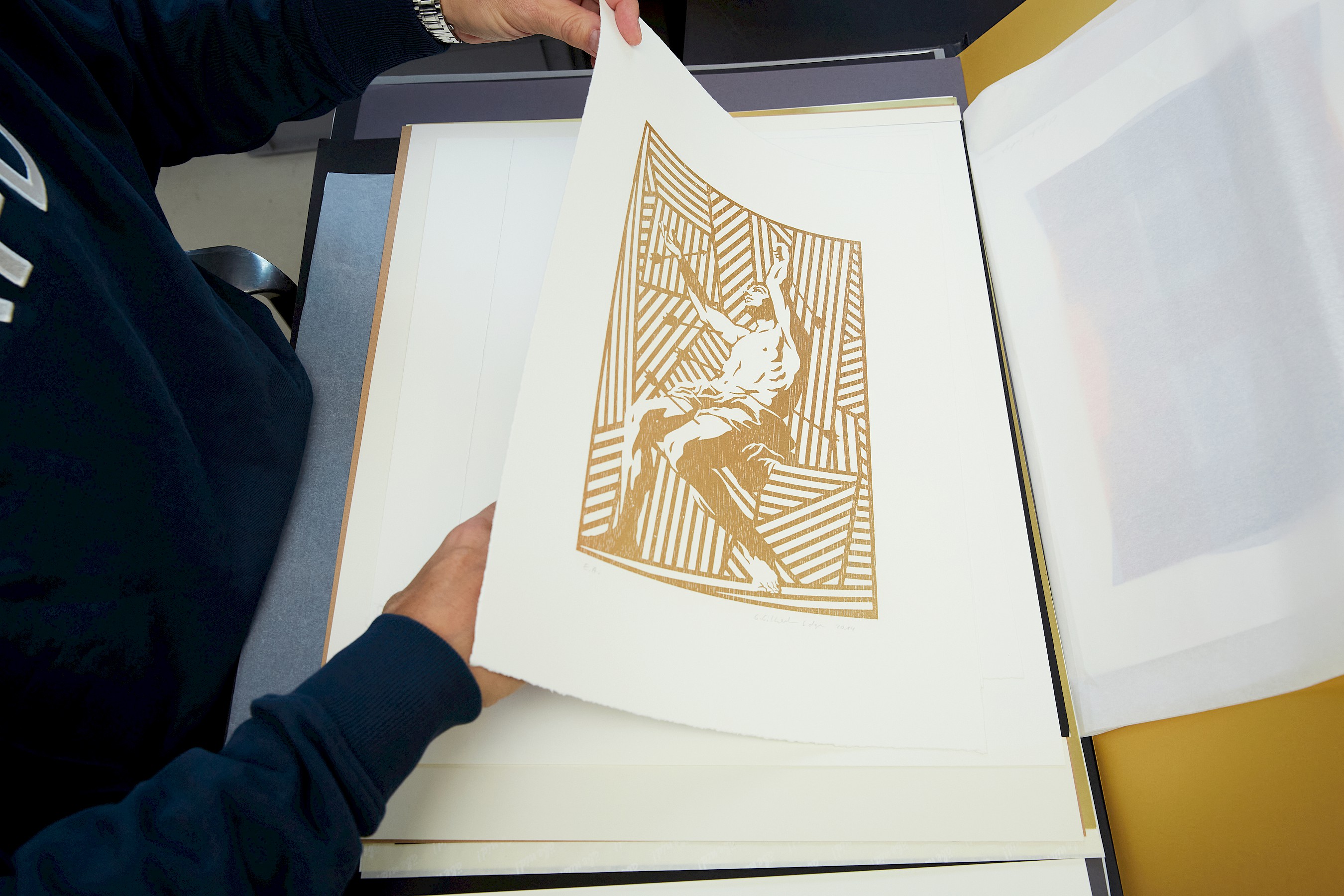 Für seine persönliche Arbeit greift er aber sehr gerne auf analoge Werkzeuge wie Farbe und Pinsel zurück, oder fertigt Holzschnitte an, wie das ikonisches Bild des Heiligen St. Sebastian, einen Holzschnitt-Druck in limitierter Auflage.